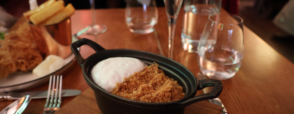 E il merluzzo (cod)? Semplicemente perfetto. La panatura è dorata e croccante, mentre il pesce all’interno rimane morbido e scioglievole al palato. Puoi sceglierlo con la pelle (opzione consigliata dallo chef) oppure senza. Il piatto è accompagnato da una classica crema di piselli schiacciati, da una sorprendente maionese alle patate e da una profumata salsa al curry.